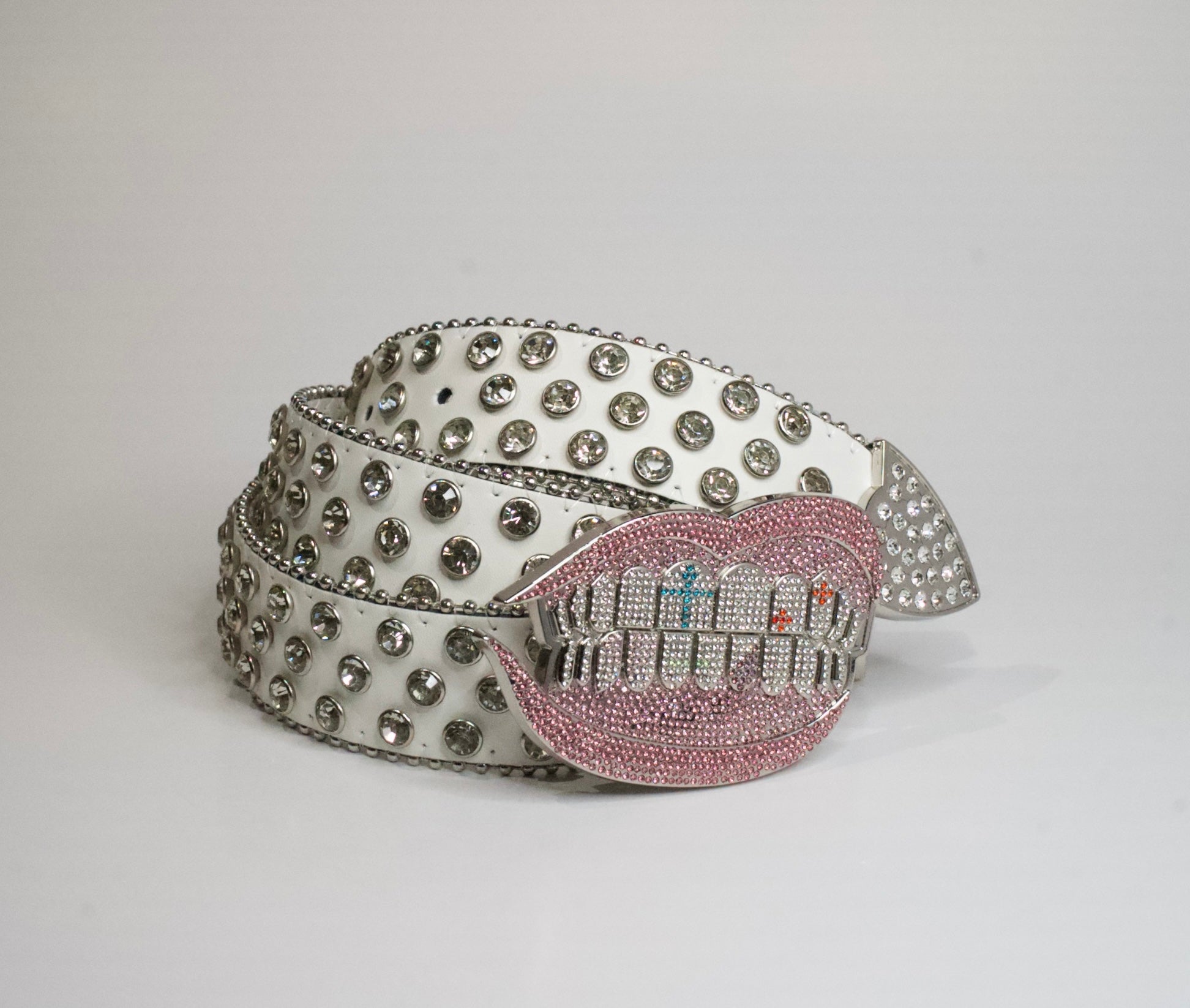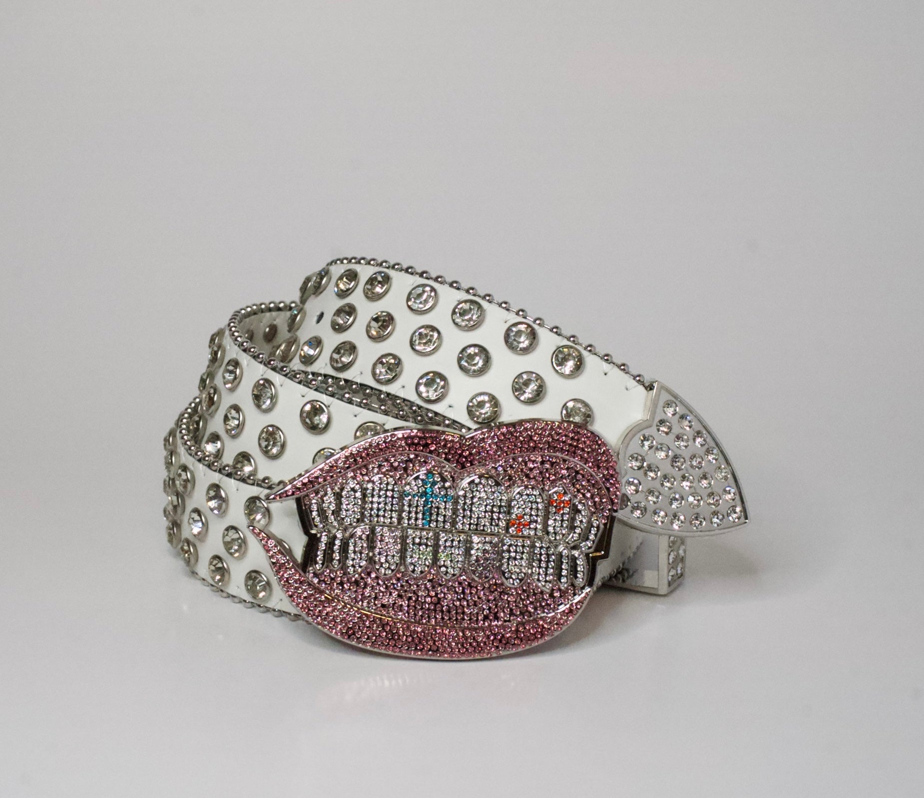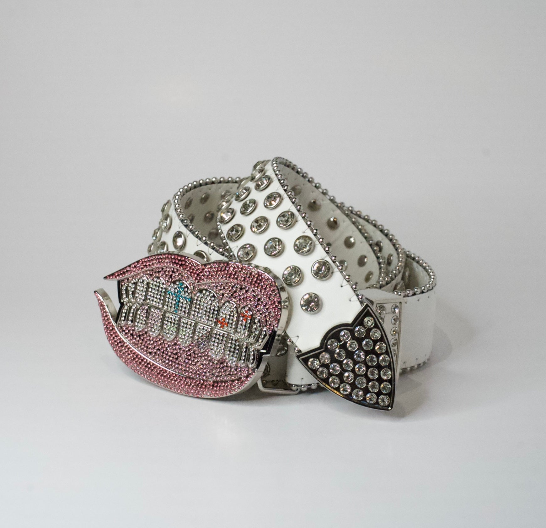 Our "Starberry Kiss" belt features a hand drawn design bringing the luxury iced out grill look into everyday streetwear fashion. This time, adding different shades of pink to the gums and lips to give the grill even more pop. The oversized lip and grill combo with the white faux leather strap covered in large, clear rhinestones is designed to turn heads with its flashy look. Whether you're posting up for social media, having a night out in the city, or just looking to get fly, our "Starberry Kiss" belt is the perfect choice.